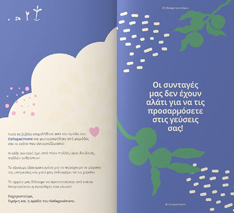 Αγόρασα το βιβλίο με τις εξατομικευμένες συνταγές. Τα καλύτερα λεφτά που έχω δώσει ! Φτιαγμένες συνταγές για το μωράκι μου , εύκολες και πεντανόστιμες. Δεν χρειάζεται να σκέφτομαι “τι θα φτιάξω πάλι “. Το συστήνω ανεπιφύλακτα!